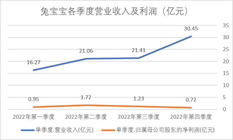 以上述数据测算,2022年四季度兔宝宝实现营业收入30.45亿元,为全年最高;但归属于上市公司股东的净利润为0.72亿元,为全年最低。“金九银十”一般为家居行业旺季,但兔宝宝却“增收不增利”。