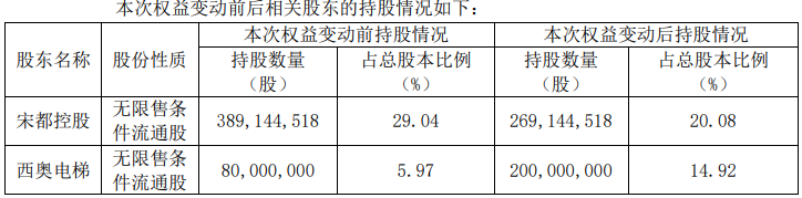 宋都股份每股本次转让完成后,宋都控股的持股比例降至20.08%;而西奥电梯的持股比例提升至14.92%。