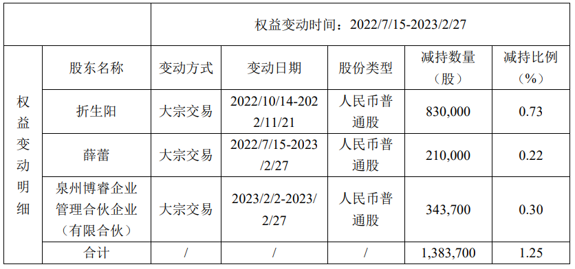 伴随着年初至今的股价回调,铂力特的两名实控人也在加紧套现。2月27日公告显示,铂力特实控人折生阳、薛蕾及其控制的泉州博睿合计持有公司股份比例将从28.53%减少至27.00%。按照2月27日股价估算,上述股东此次通过减值可直接套现2.2亿元。