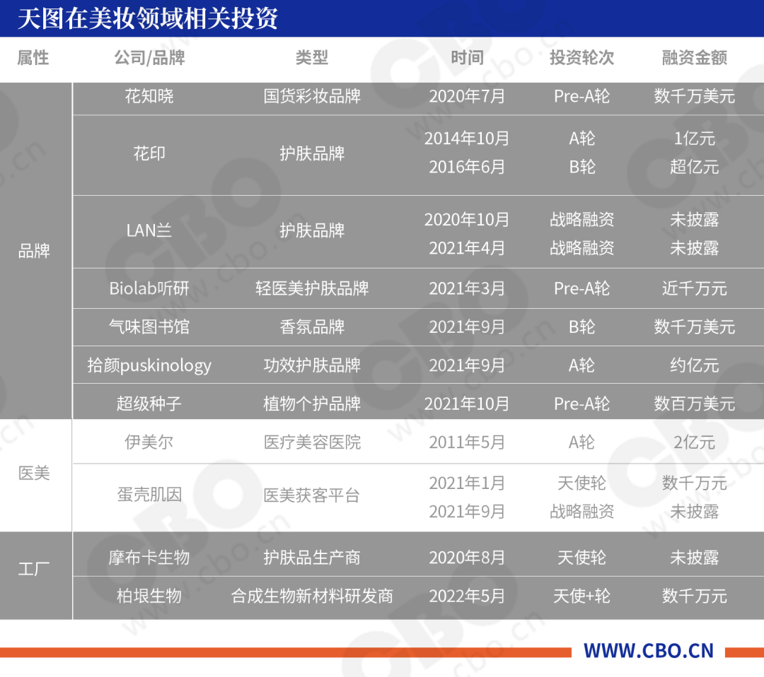 据CBO不完全统计,天图在美妆相关领域的投资项目共计16个,覆盖面不仅包括品牌,还包括生产商、服务商、平台等。