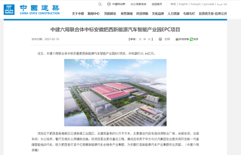 2月16日,中建六局联合体中标安徽肥西新能源汽车智能产业园EPC项目,中标额约15.44亿元。公告内容显示,该项目是合肥市重点工程,建成后将用于华为与江汽集团在合肥共同开发新一代高端智能电动汽车。