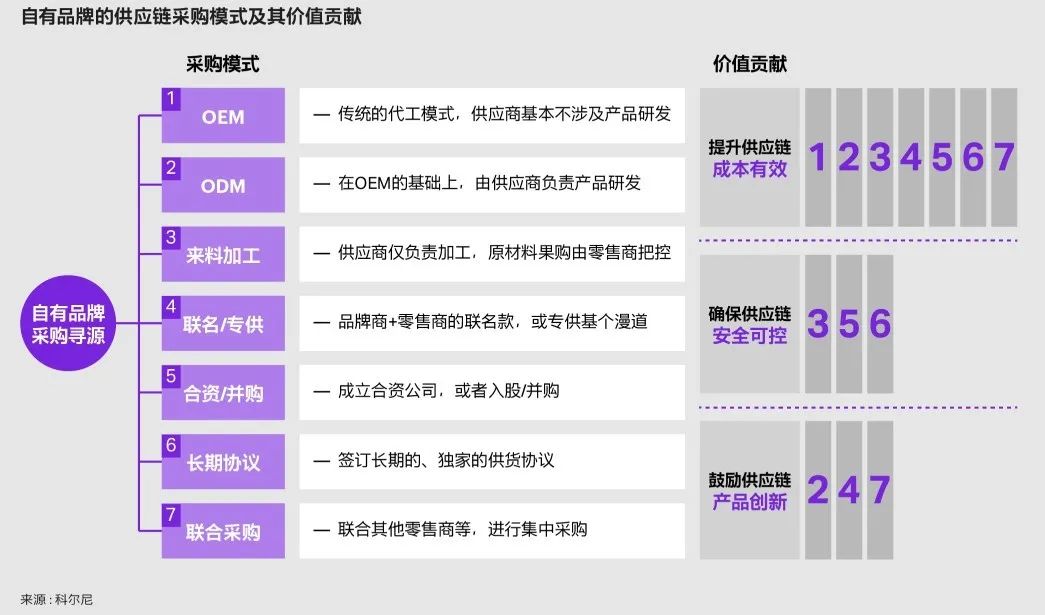 具体来看,在OEM、ODM的基础上,零售商可以通过来料加工的形式控制供应商的上游原材料采买,从而更好地确保产品品质,并发挥集中化、规模化采购的成本优势。