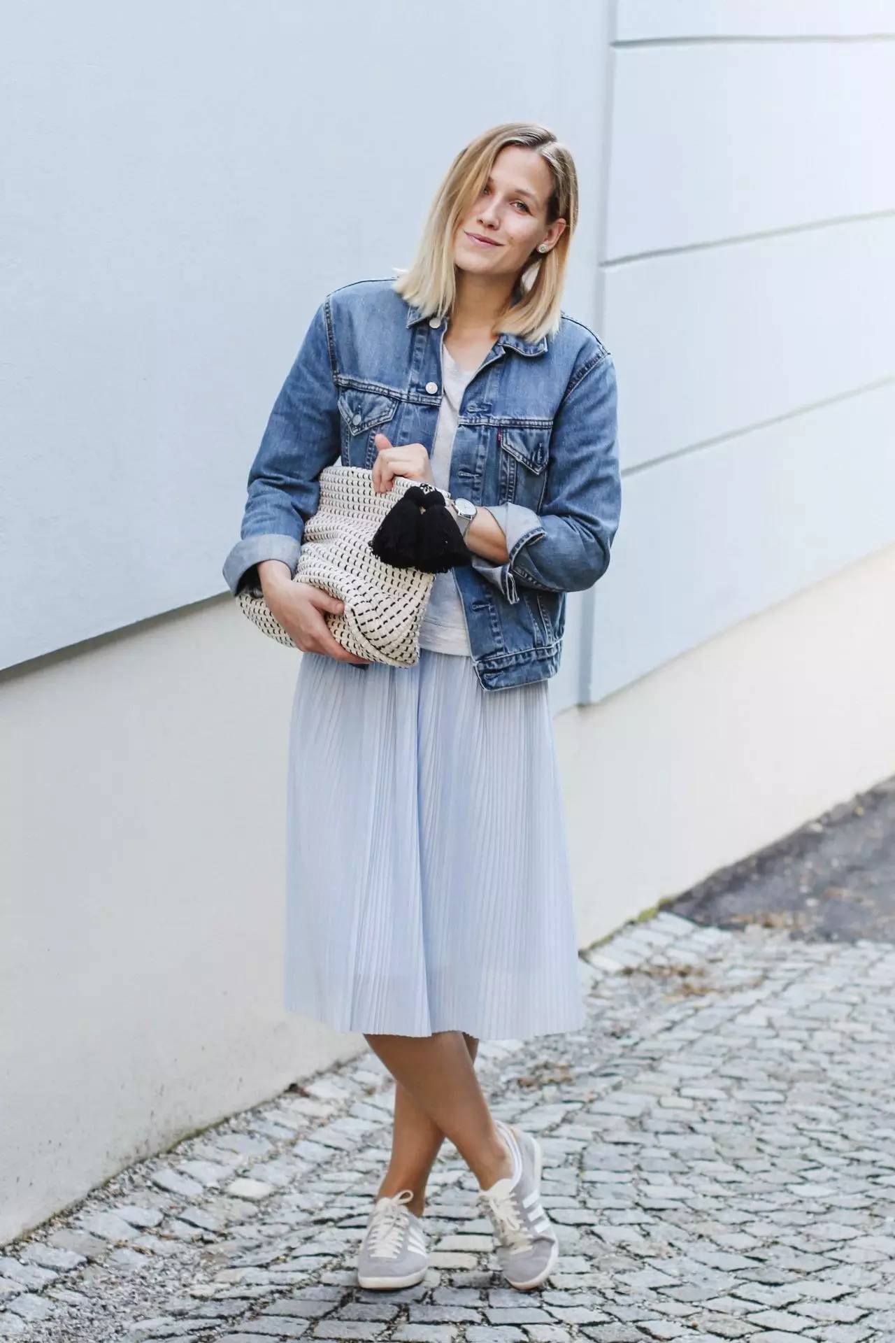 搭配的话,可以像KK这样披个外套或者穿个阔腿裤或今年很流行的校服裤。