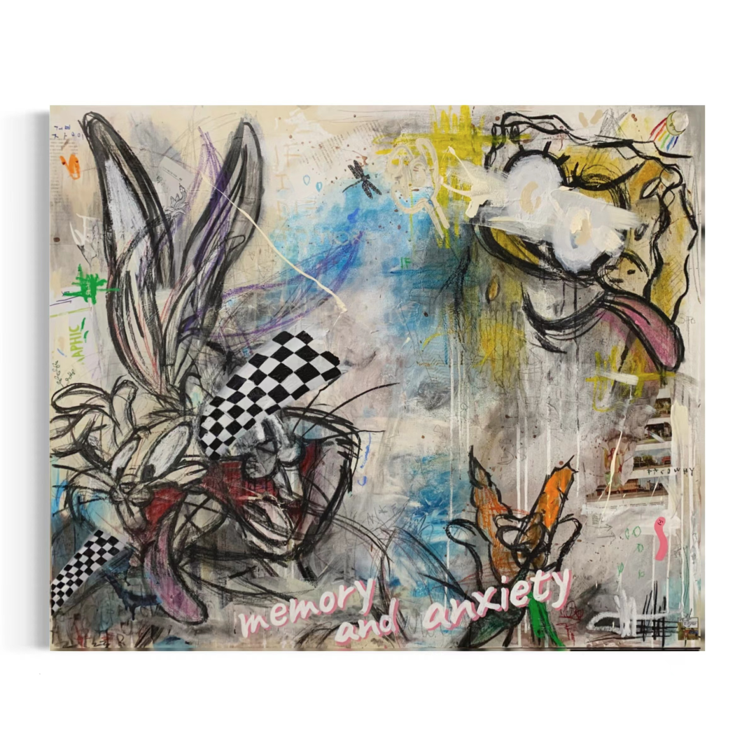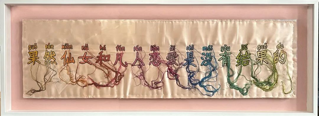 大家好,我是艺术家沈娜。我的作品属于本次展览三个系列中的流行文化单元,它可以分成文字和图像两部分。文字部分跟我自己生活里情感经历有一些关系。图像部分则是有两个内容结合起来,一方面我使用了一些现在年轻人喜欢的卡通图像,例如鬼面之刃等等,以正义和邪恶的两方力量斗争为大结构,再使用最近两年新实验的综合材料作为创作语言去创作。
