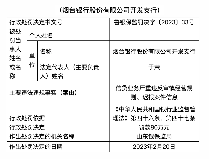山东银保监局2月28日披露的行政处罚信息公开表显示,2023年2月20日,烟台银行股份有限公司开发支行因信贷业务严重违反审慎经营规则、迟报案件信息,被处罚款80万元。