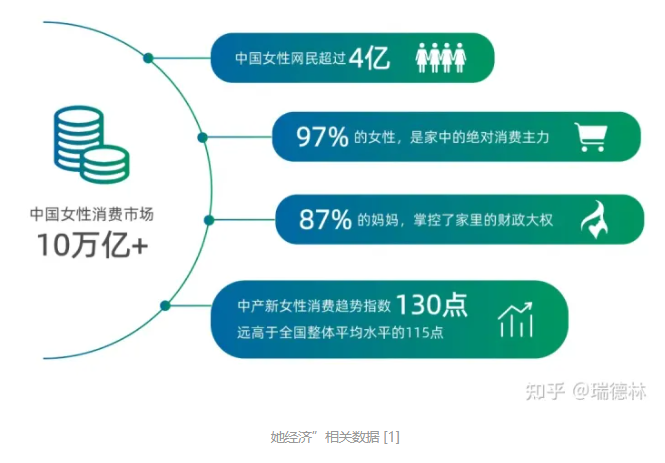 数据来源:中国女性网民数量、女性消费市场数据来自凯度《Z世代消费力白皮书》、艾瑞《95后时尚消费报告》,中产新女性消费趋势指数来自尼尔森,女性家中财政决策地位数据来自2020-CBNData女性品质生活问卷调研