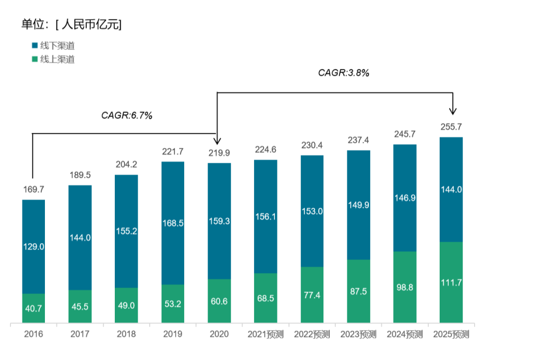 头豹研究院数据指出,未来中国口服美容行业预计迎来新一轮增长,于2025年市场规模达255.7亿元,复合增长率为3.8%,口服美容行业的市场规模将平稳增长。