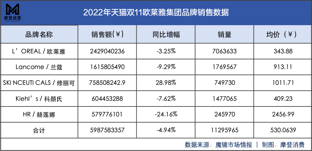 根据魔镜市场情报向「摩登消费」提供的数据,2022年和2021年连续两年双11,欧莱雅共有5个护肤品牌进入天猫销售榜单前20名,为欧莱雅、兰蔻、赫莲娜、科颜氏和修丽可。