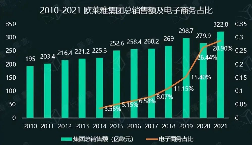 2012年左右,欧莱雅曾遭遇增长危机,正是之后决意进行数字化改革,为其开启了新一轮增长通道,而电商布局正是其中的关键一环。2014年-2021年,欧莱雅电商收入占比已从3.58%上升至28.9%,增加了近10倍。