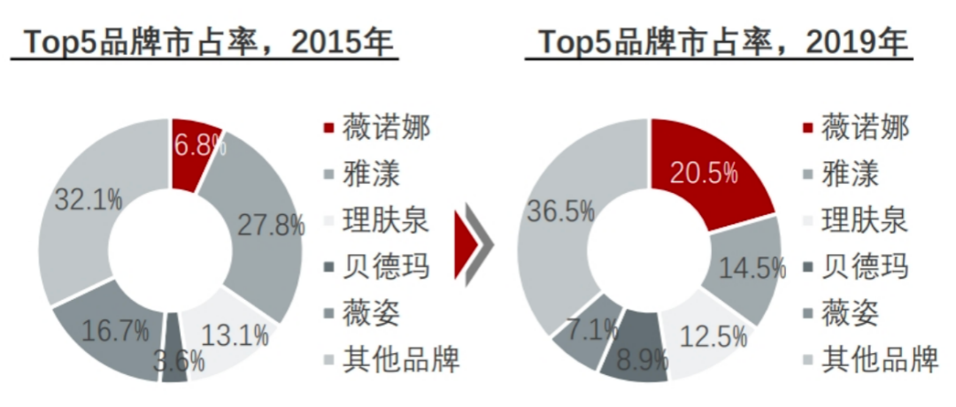 2015年至2019年,国内品牌薇诺娜市场份额从6.8%提升至20.5%,替代理肤泉成为第一名。同期,欧莱雅旗下的理肤泉和薇姿市占率分别从27.8%与16.7%,下降至14.5%与7.1%。