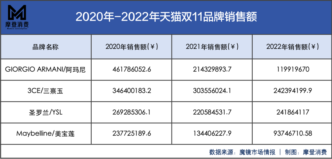 2022年,这5个品牌在天猫双11的销售额,除修丽可之外,均呈现同比下降。