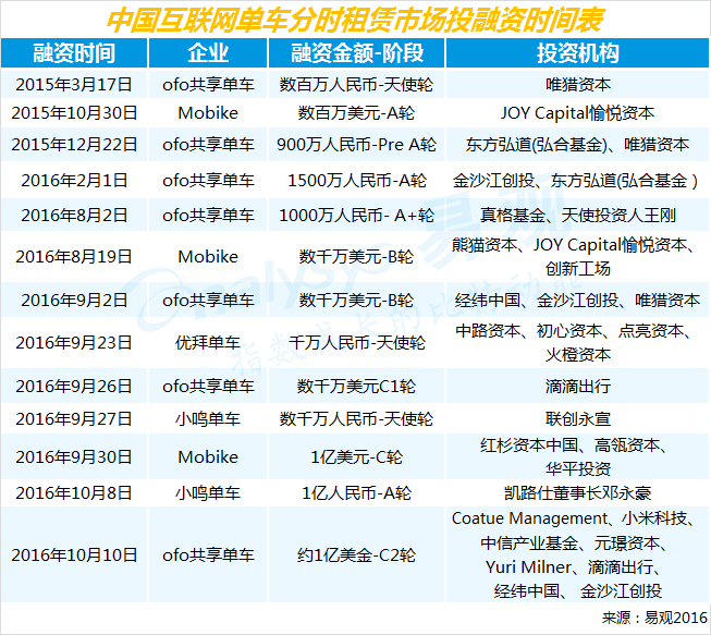 资本寒冬下,短短几个月内,ofo共享单车已完成五轮融资,而与ofo共享单车同处第一梯队的Mobike也已于9月30日宣布完成1亿美金的C轮融资,投资方为高瓴资本、红杉资本中国、华平投资、启明创投等。