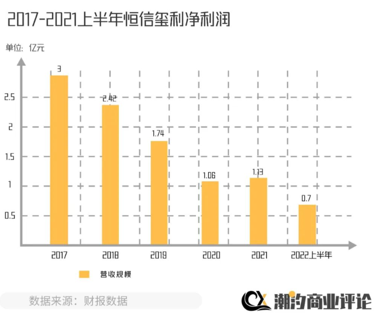 其经营困境在财报数据中也得以体现,2017-2021年,恒信玺利实现净利润分别为3.00亿元、2.42亿元、1.74亿元、1.06亿元、1.13亿元。到了2022年上半年,净利润仅为704.44万元,同比下降88.62%,利率下滑严重。