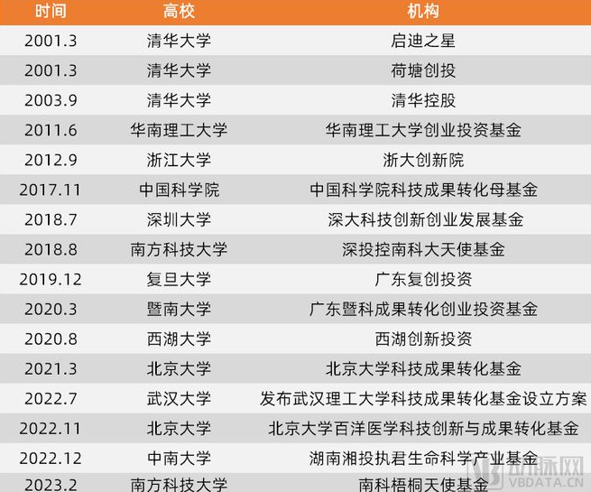 中国科学院科技成果转化母基金、湖南湘投执君生命科学产业基金(中南大学)、深控投南科天使基金(南方科技大学)等大多高校VC都拥有不同的LP资源组合。此外,企业捐赠、大学校友基金出资也是高校VC的募资方式。