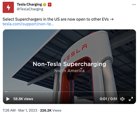 3月1日,特斯拉宣布,正式向美国非特斯拉电动汽车车主开放部分超级充电站,价格因站点而异,车主可在特斯拉应用程序中查看充电价格。据了解,2021年11月,特斯拉启动非特斯拉超级充电站试点项目。