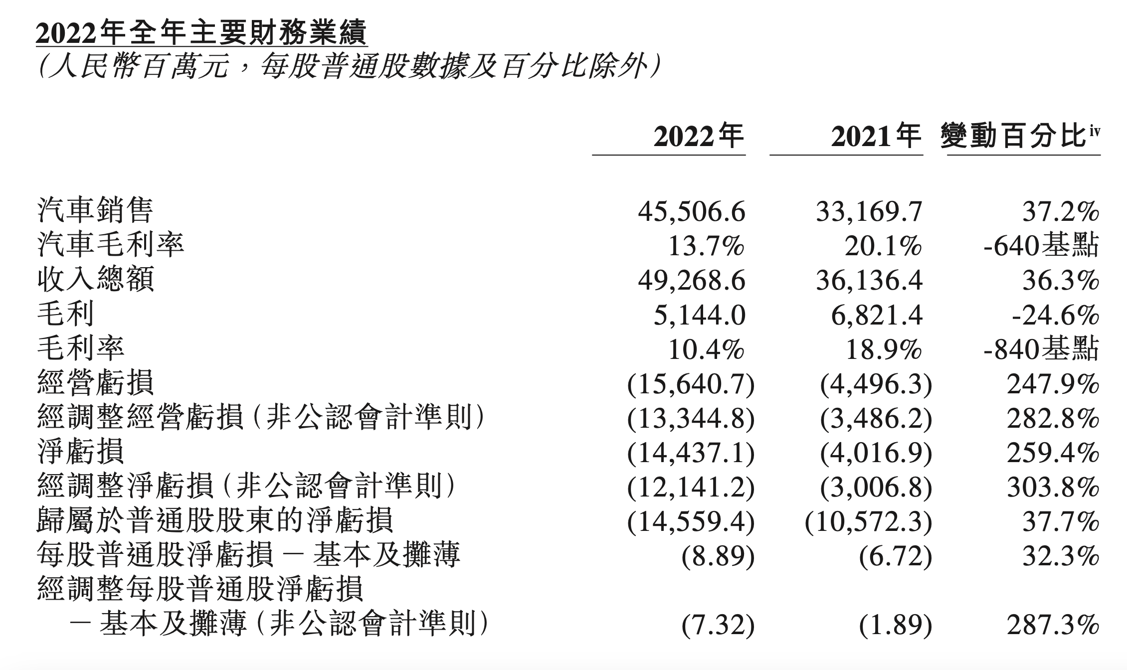 在营收增长的同时,蔚来的亏损也在进一步扩大。四季度净亏损扩大至57.86亿元,同比和环比分别增长169.9%、40.8%。2022年全年净亏损达144.37亿元,较上年同期亏损扩大259.4%。