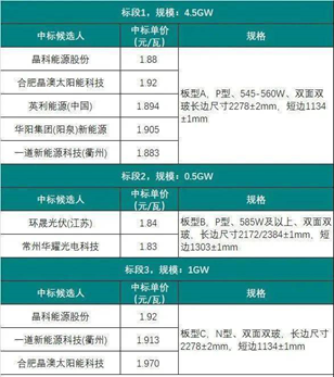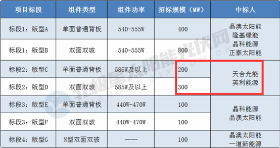 2022年5月24日,中国华能集团有限公司电子商务平台公布华能2022年度光伏组件(第一批)框架协议采购项目中标结果。中标企业共有7家:晶澳、隆基绿能、晶科能源、浙江正泰、天合光能、英利、一道新能源。天合光能和英利加在一起,共500MW。