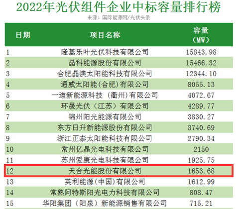 根据国际能源网/光伏头条(PV-2005)统计,2022年,央企光伏组件招投标项目数量375个,合计容量154.99GW。天合光能位列第十二位。以天合光能的江湖地位,这个排名不算理想。