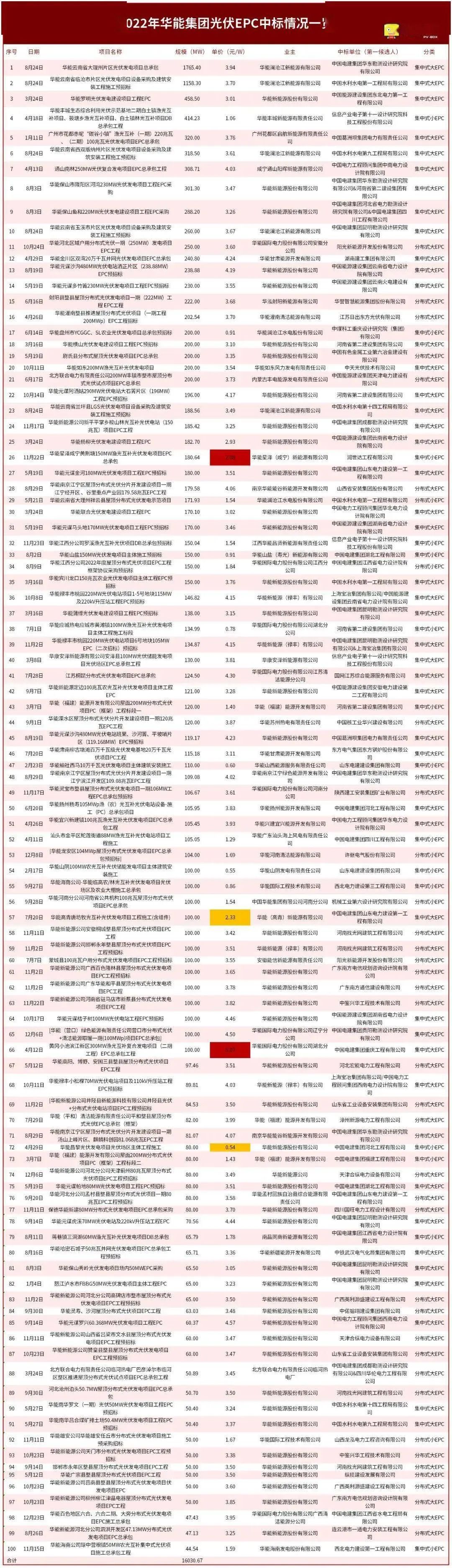 表8;2022年华能集团前100个光伏电站EPC中标情况;来源:光伏盒子