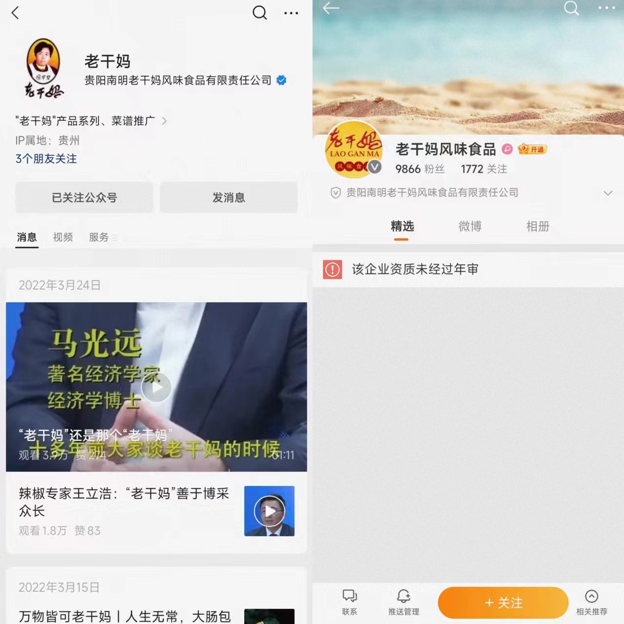 老干妈官方微信公号的最后一条内容发布于2022年3月24日,头条标题为《“老干妈”还是那个“老干妈”》,内容是经济学者马光远的一段视频讲话。老干妈官方微博“老干妈风味食品”账号已暂停使用,进入后显示是因“该企业资质未经过年审”。