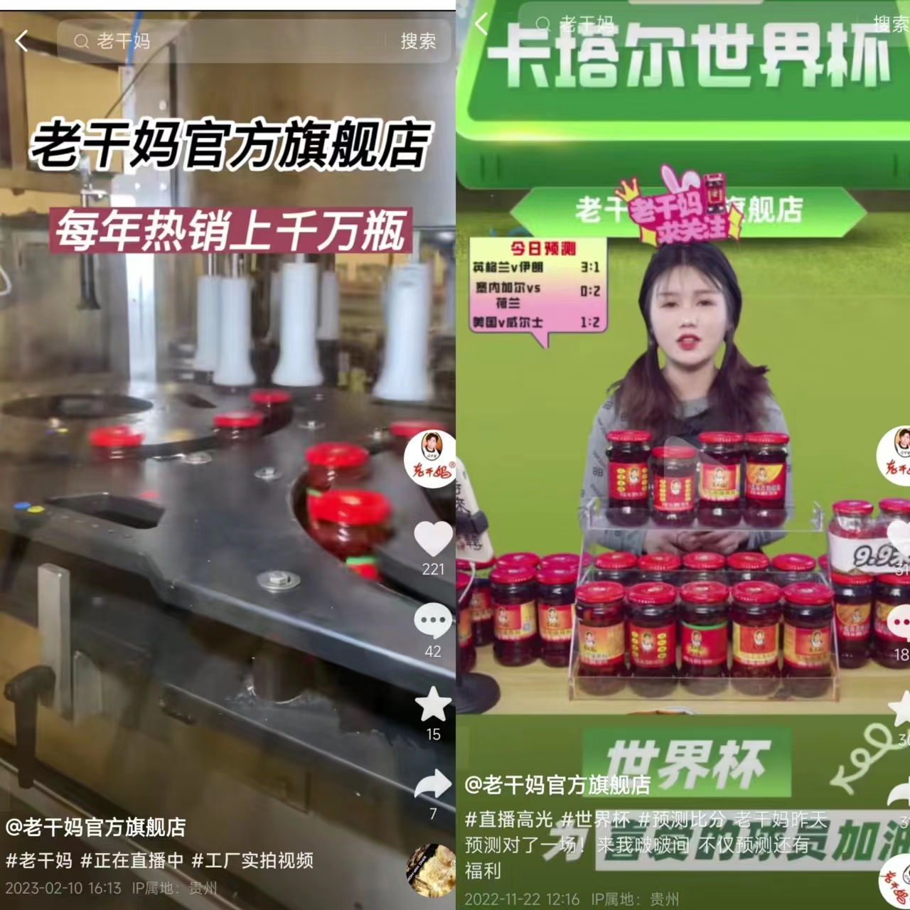 老干妈在抖音并非全然“躺平”。就在2022年11月22日,它还借预测世界杯比分来宣传老干妈直播间。