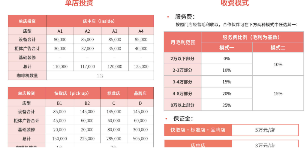具体来说,店中店分A1、A2、A3、A4这四种店型,设备、柜体广告等投资费用在11万元至12.5万元之间;快取店分B1、B2两种店型,投资费用分别为15万元和22.5万元;标准店和品牌店只有一种店型,投资费用分别为28.5万元、50.5万元。