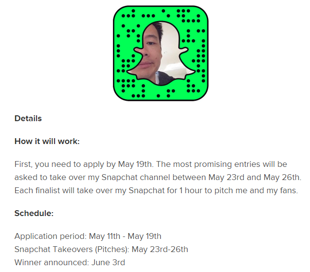 然而,Kan并没有知难而退,而是继续着他的创投之路,此次在Snapchat上发起活动就是有力的证明。只不过,他用了更公平、公开的方式,让创业者获得更多的机会。