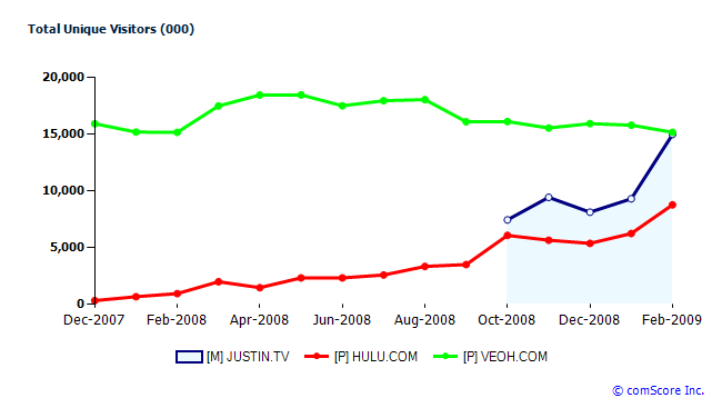 根据ComsScore(全球性互联网信息服务提供商)提供的数据,美国在线视频2月的排行榜上,Justin.tv的“每分钟观众数”排名第二,仅次于Netflix,成为年轻人首选的最热门在线视频平台。