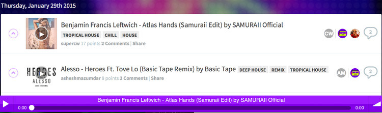 The Drop 的基础是开源内容管理界面 Telescope 和 SoundCloud API,这个网站可以在线播放当天最受用户欢迎的歌曲列表。如果用户想在上面添加音乐,只需要将歌曲的 SoundCloud 链接复制过来就行了。用户还可以切换查看最近或者历史最佳歌曲,或者按照不同的类型来挖掘音乐。