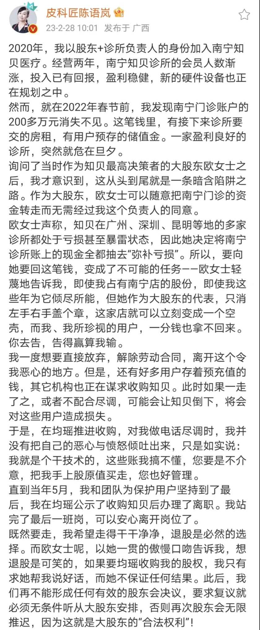 近日,知名民营医疗机构知贝医疗南宁门诊原负责人、小股东陈语岚医生在微博发文,讲述了2022年春节前,彼时的知贝医疗大股东欧茜在前者不知情的情况下,划走南宁门诊账户200多万元资金的事件。此前,陈语岚已于2022年5月从南宁门诊辞职,但目前仍持有南宁门诊股份。