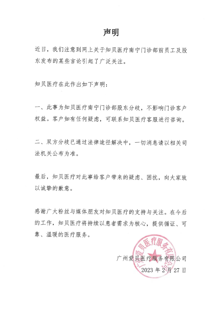 而2月27日晚,知贝医疗在其官方微信公众号发布声明。声明称:近日,知贝医疗注意到网上关于知贝医疗南宁门诊部前员工及股东发布的某些言论引起了广泛关注。此事为知贝医疗南宁门诊部股东分歧,不影响门诊客户权益。双方分歧已通过法律途径解决中,一切消息请以相关司法机关公布为准。
