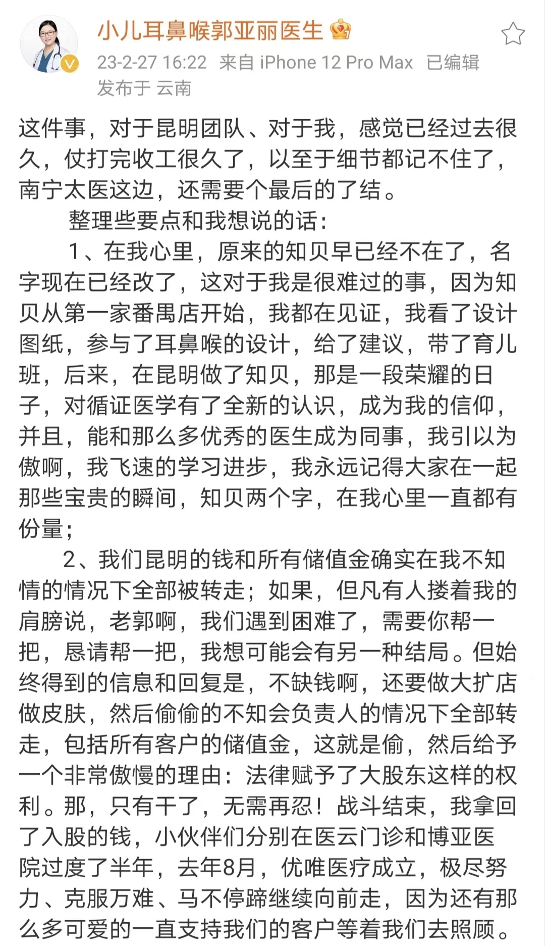 曾任职于知贝医疗昆明门诊的郭亚丽医生转发陈语岚医生微博并表示,知贝医疗旗下的昆明门诊此前同样出现过在负责人不知情的情况下,账上资金被转走的情况。此前,郭亚丽为知贝医疗昆明门诊负责人,其于2022年2月离职。