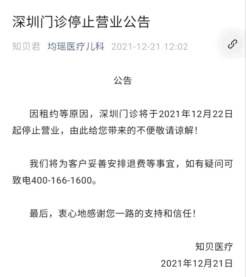 换而言之,网点中的明星医生离职,可能会导致批量的用户退费,这对公司来说无疑是现金流挑战。陈语岚告诉界面新闻,起先,2021年中,广、深、中山门诊部的多位明星医生先后离职。接着,2021年12月21日,深圳门诊在此前没有通知的情况下,突然关门停诊。