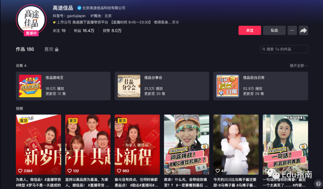 而”高途佳品“抖音账号粉丝关注数为16.4万——暂未及创始人IP表现。