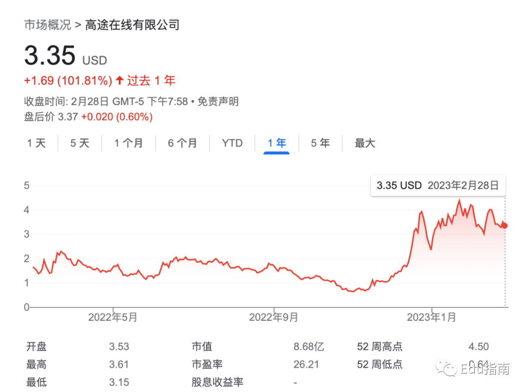 关于高途,该公司创立于2014年,提供学习服务、教育内容和数字化学习产品。 当前高途教育服务覆盖高中全科、素养、家庭教育、考研、财会、公考、教资、留学及语言培训等。高途2019年在美国纽交所上市,过去一年股价回升102%,当前市值为8.7亿美元。