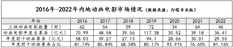 像在2016年2019这两个动画电影大年,前十动画的累计票房都分别达到了58.03亿元和94.1亿元,光是这少数几部影片的票房产出,就已经超过了2017、2018以及疫情后三年的整个动画电影市场总量。