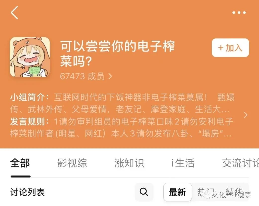 2022年11月,豆瓣小组“可以尝尝你的电子榨菜吗?”成立,迄今已聚集近七万名成员,成为豆瓣新组排行榜的新晋“王者”,组员们相互安利各种口味的“电子榨菜”,包括各种类型的影视剧集、影视综艺等。
