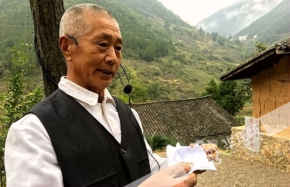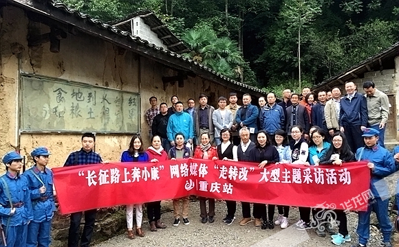 12日,细雨中,沿着红军走过的路,采访团一行来到巫溪通城镇长红村红三军司令部旧址,参访红军标语墙。墙上写着“红军为穷人得到土地和粮食”的标语。