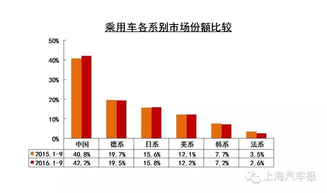 1-9月,自主品牌乘用车共销售707.18万辆,同比增长18.72%,占乘用车销售总量的42.21%,占有率比上年同期提升1.41个百分点。德系、日系、美系、韩系和法系乘用车分别销售326.42万辆、263.90万辆、203.84万辆、120.27万辆和43.34万辆,与上年同期相比,法系乘用车销量下降较快,其他外国品牌保持增长。