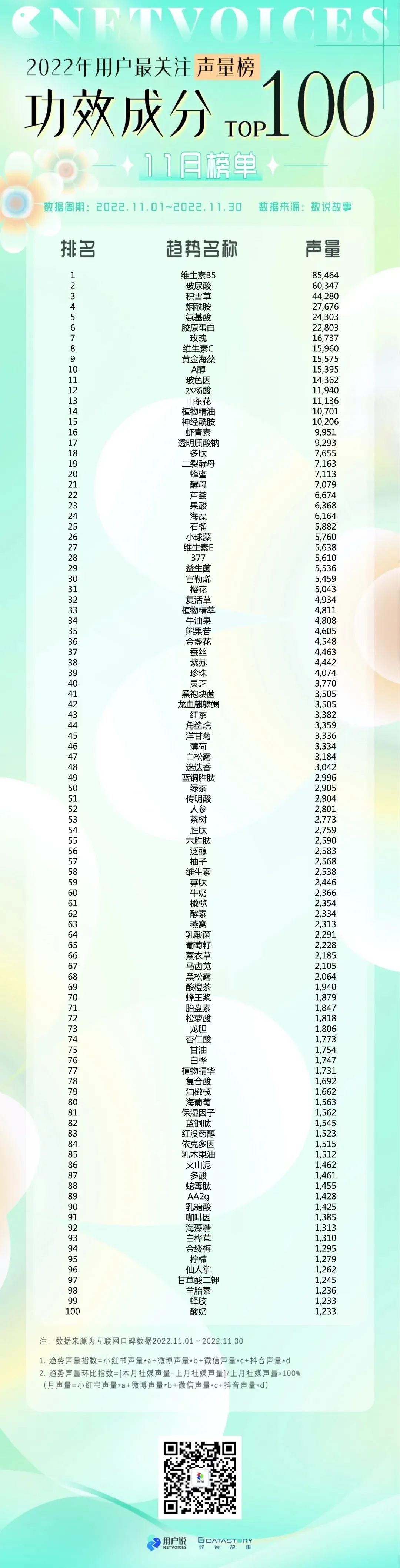 自2019年起,“早C晚A”跃升成为万能护肤公式,掀起全民讨论。此后更有媒体指出,A醇自2020年2月以来,其社媒声量就已正式赶超胜肽,一直位列抗衰成分的热度第一,由此2020年也被称为“A醇元年”。另据用户说观测的2022年用户最关注功效成分11月声量榜显示,A醇声量位列第10席位,玻色因位居第11位,胜肽位居第54位。