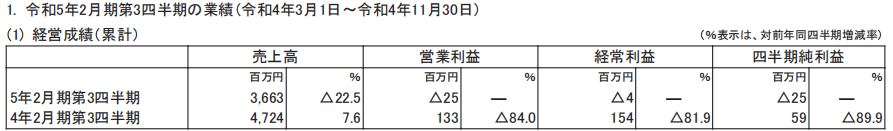 2022年二、三、四季度(2022.3.1-2022.11.30),Broccoli累计销售额36.63亿日元,同比下降22.5%;营业亏损2500万日元;归属股东当期纯亏损2500万日元。