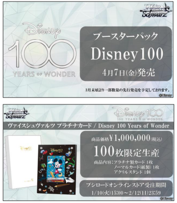 今年3月份,《Wei Schwarz(黑白双翼)》将迎来15周年纪念,预定发售加强包《Disney100》,同时限量发售100张米老鼠白金卡牌,这也是武士道初次尝试制作发售贵金属高额卡牌。