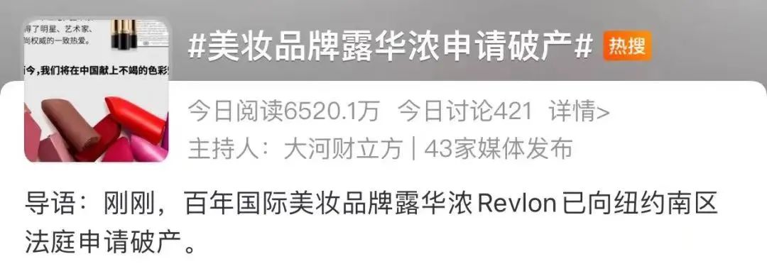 事实上,在此之前,露华浓早已年复一年地游走在破产边缘。2020年11月,露华浓就因“申请破产”登上过微博热搜,彼时在国内市场还引发了一波抢购潮。