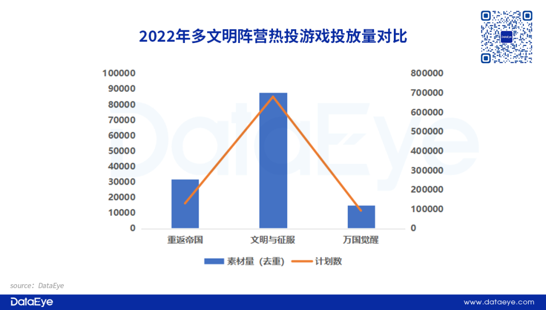 《文明与征服》在素材投放量以及计划投放数都排名多文明阵营第一,《重返帝国》凭借上线爆发阶段的投放表现排名第二。而阵营老前辈《万国觉醒》整体表现佛系,排名最后。