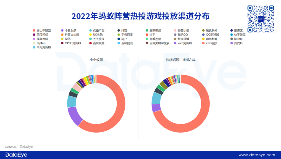 蚂蚁阵营投放渠道侧重点明显,穿山甲联盟是主要投放渠道,两款蚂蚁题材SLG投放占比均超过50%。另外,今日头条和优量汇也是蚂蚁阵营主要的投放渠道。整体来看,蚂蚁阵营投放比较集中。