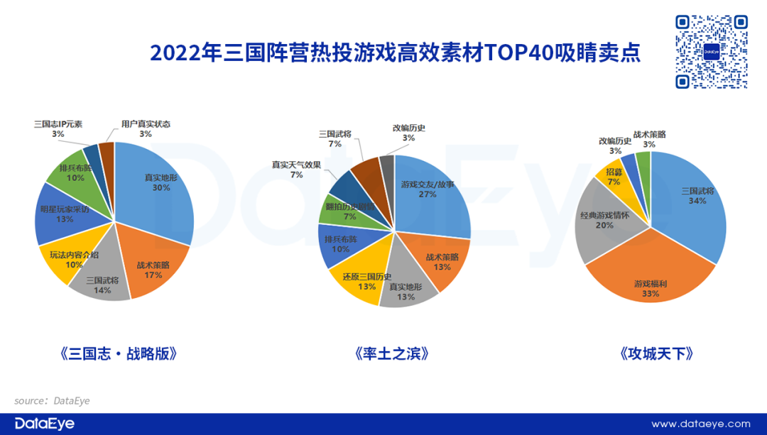 长久以来,三国题材的创意素材都呈现出厚重的历史氛围感,但脚本也有明显的格式化、脸谱化,而这类型素材或许让不少用户视觉疲劳,加上赛道进入存量市场,转化率也随之下降。DataEye研究院认为,目前国内热投产品呈现出三个营销思路方向:
