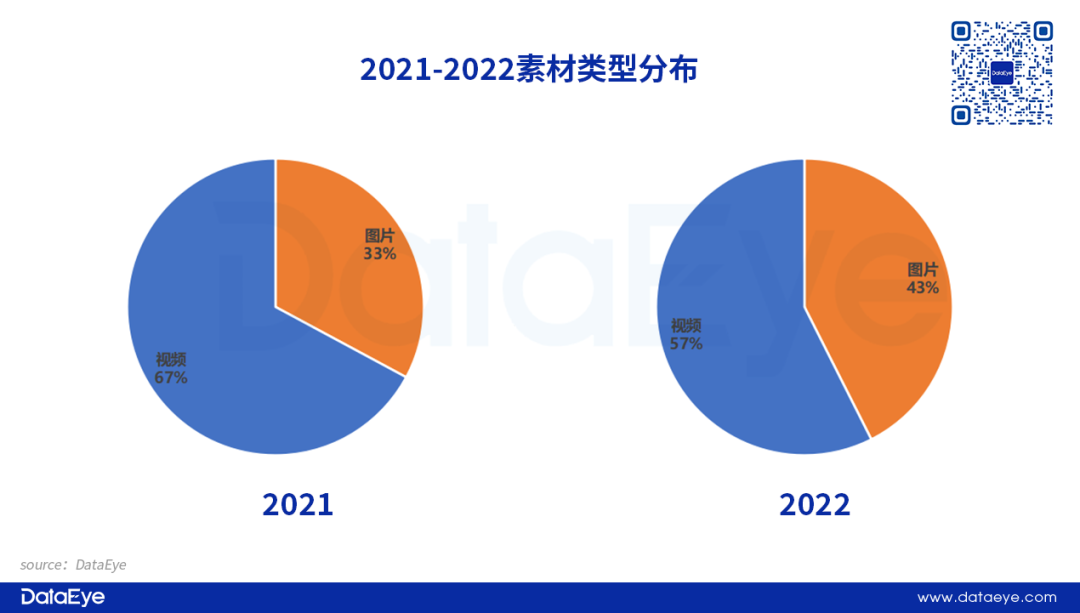 2022年SLG投放素材类型中,视频素材占比为57%,而图片素材为43%。对比2021年SLG投放素材数据,图片素材占比增加约10个百分点。