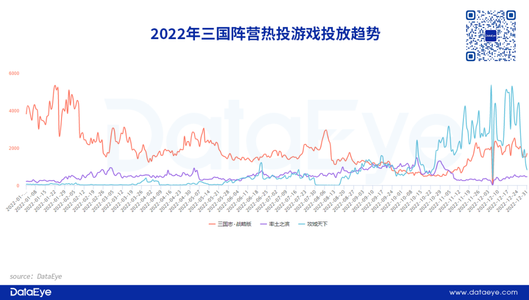 从投放趋势来看,《三国志·战略版》投放表现在2022年全年呈现明显的下滑,投放量集中于春节档期间,Q4有所回暖;《率土之滨》整体投放没有明显的波动,在9、10月份有小幅度提升;《攻城天下》在2022年前三季投放量较低,直到Q4投放量明显提升。