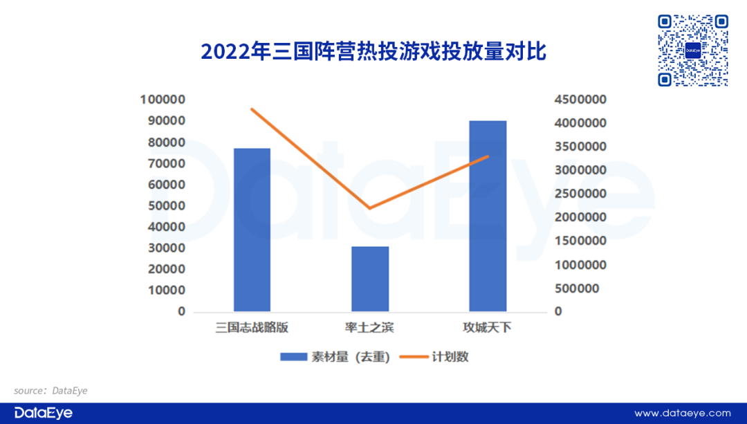 三国阵容:买量乱战影响有限,但需要跳出“舒适圈”。DataEye研究院认为,2022年买量乱战对三国阵营来说影响有限,三国题材头部产品投放下滑还是因为用户圈层难以突破,拉新效率不高等问题。因此我们可以看到《三国志·战略版》在下半年借助世界杯热点事件创作创意素材,尝试跳出“舒适圈”,以更多元的内容触及未被转化的用户。同时也需要扩宽投放渠道,触及更多用户群体。