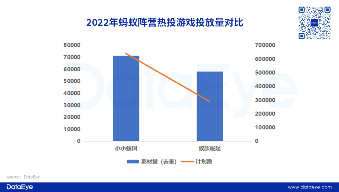 《小小蚁国》在2022年9月份上线,但自上线以来就维持较高的力度,而《蚁族崛起》也随之提升,但总投放素材量和投放计划数仍低于《小小蚁国》。